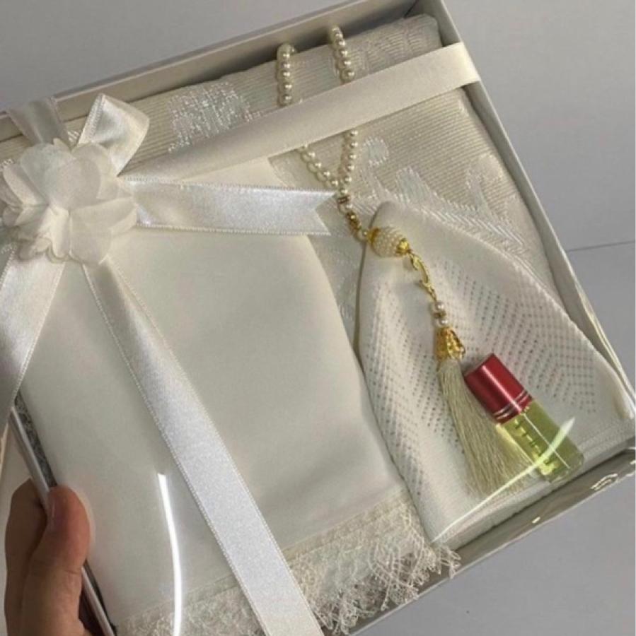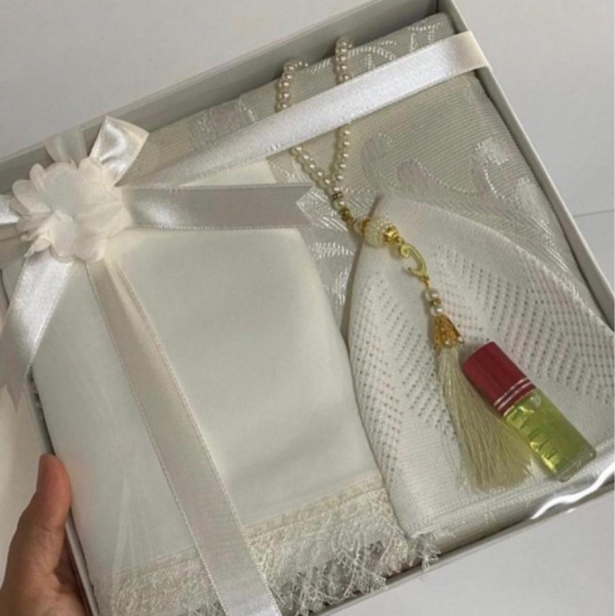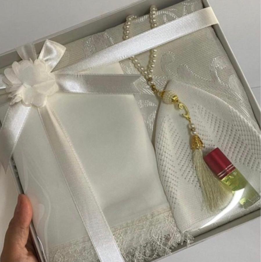 Seccade seti 1 adet seccade 1 adet namaz örtüsü oyalı 1 adet takke 1 adet inci Tesbih 1 adet esans koku ürünler görselde görüldüğü gibi gelir