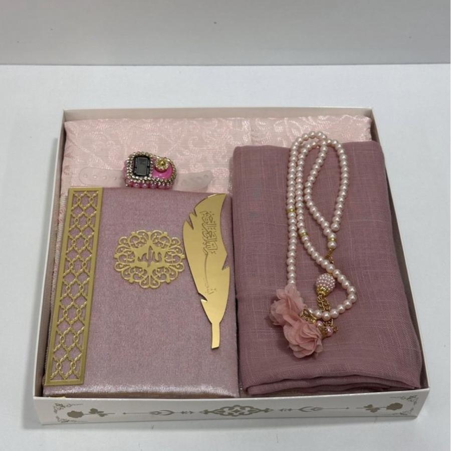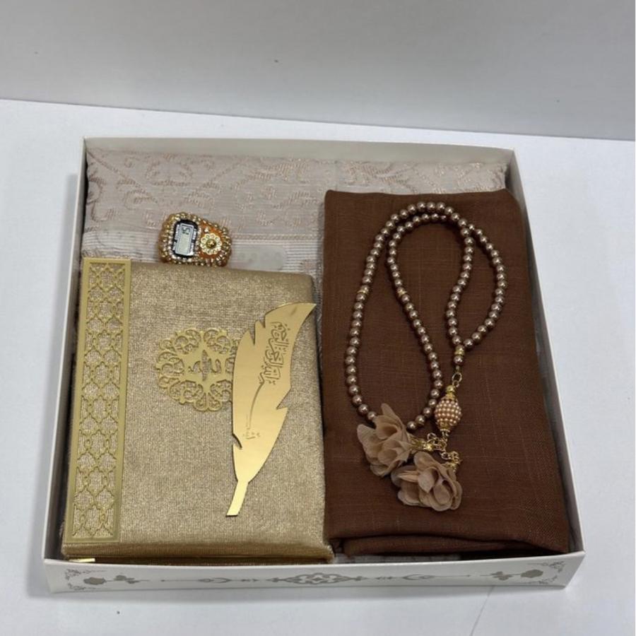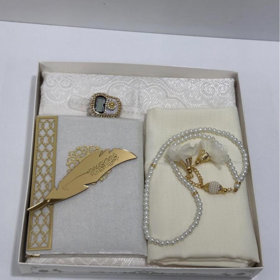 Çeyizlik seccade seti hediyelik 1 adet İpek tafta seccade 1 adet flamlı başörtü 1 adet inci güllü tesbih 1 adet taşlı zikirmatik 1 adet kitap ayraç ürünler görselde görüldüğü gibi hediye paketinde gelir