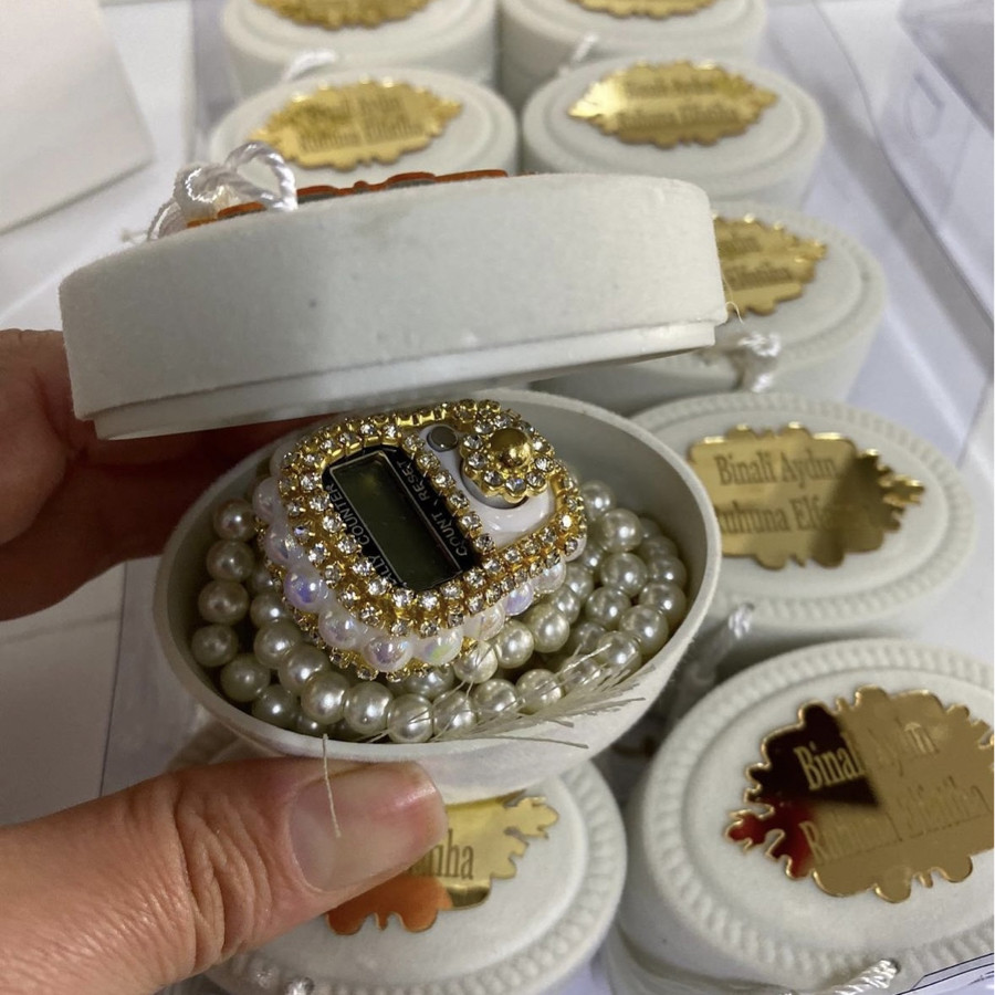 Kadife kutu içinde inci Tesbih ve taşlı zikirmatik ürünler görselde görüldüğü gibi gelir
