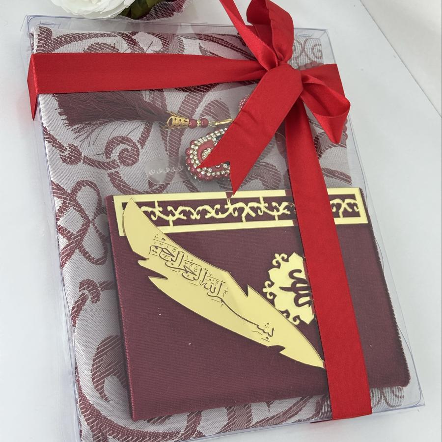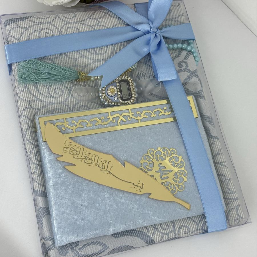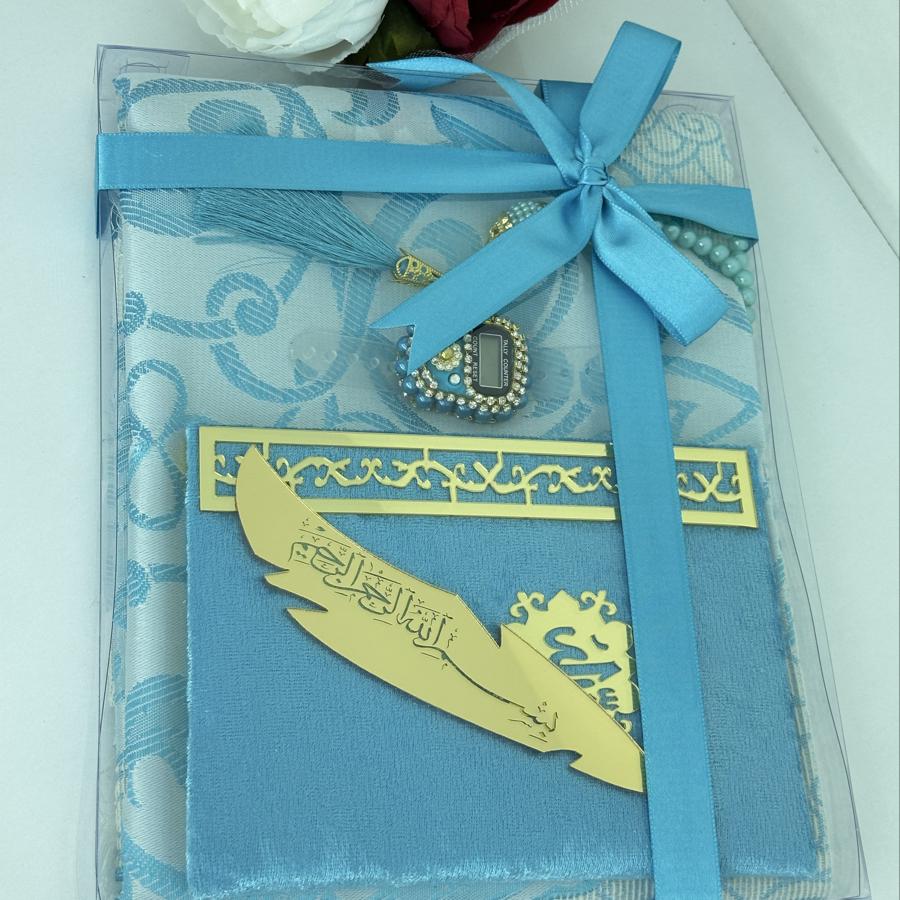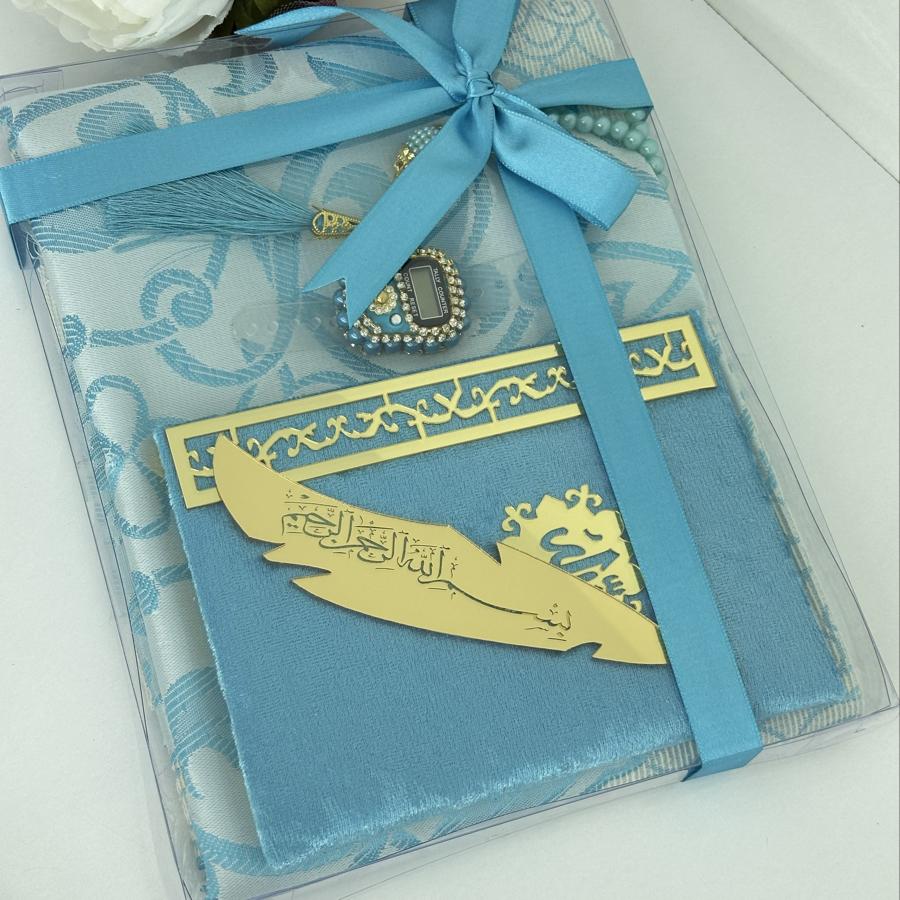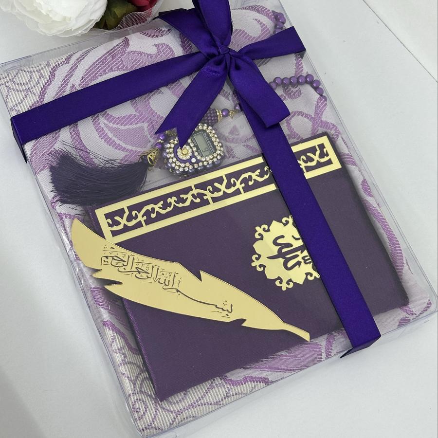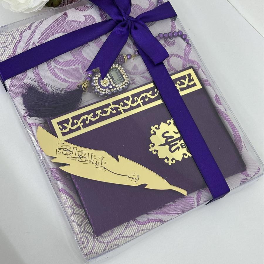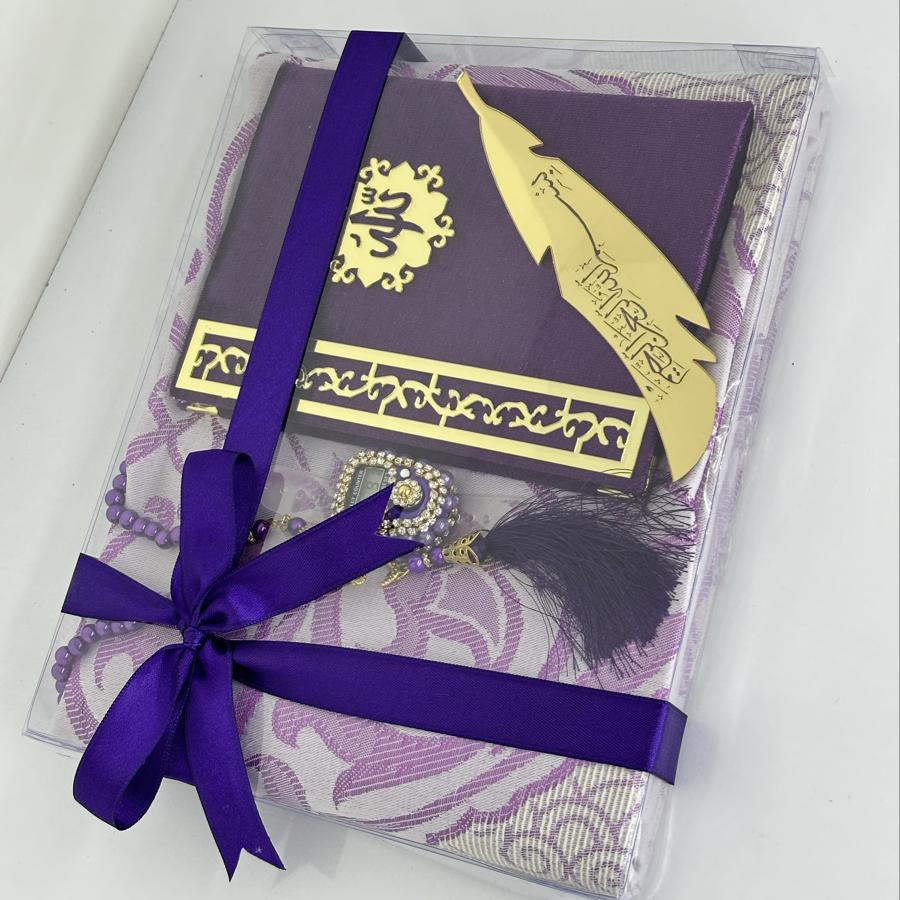 Özel Hediye Seti Sevdiklerinize manevi değeri yüksek, anlamlı ve zarif bir hediye arıyorsanız, bu set tam size göre! Set İçeriği: • 1 adet tafta seccade • 1 adet kadife kaplı Yasin-i Şerif • 1 adet 99’lu inci tesbih • 1 adet taşlı zikirmatik • 1 adet kitap ayracı Şık kutusu ve mor tonlarının asaletini taşıyan tasarımıyla; mevlüt, kandil, doğum günü, özel gün ve hatıra hediyesi olarak gönül rahatlığıyla tercih edebilirsiniz. Sipariş ve detaylı bilgi için bizimle iletişime geçebilirsiniz