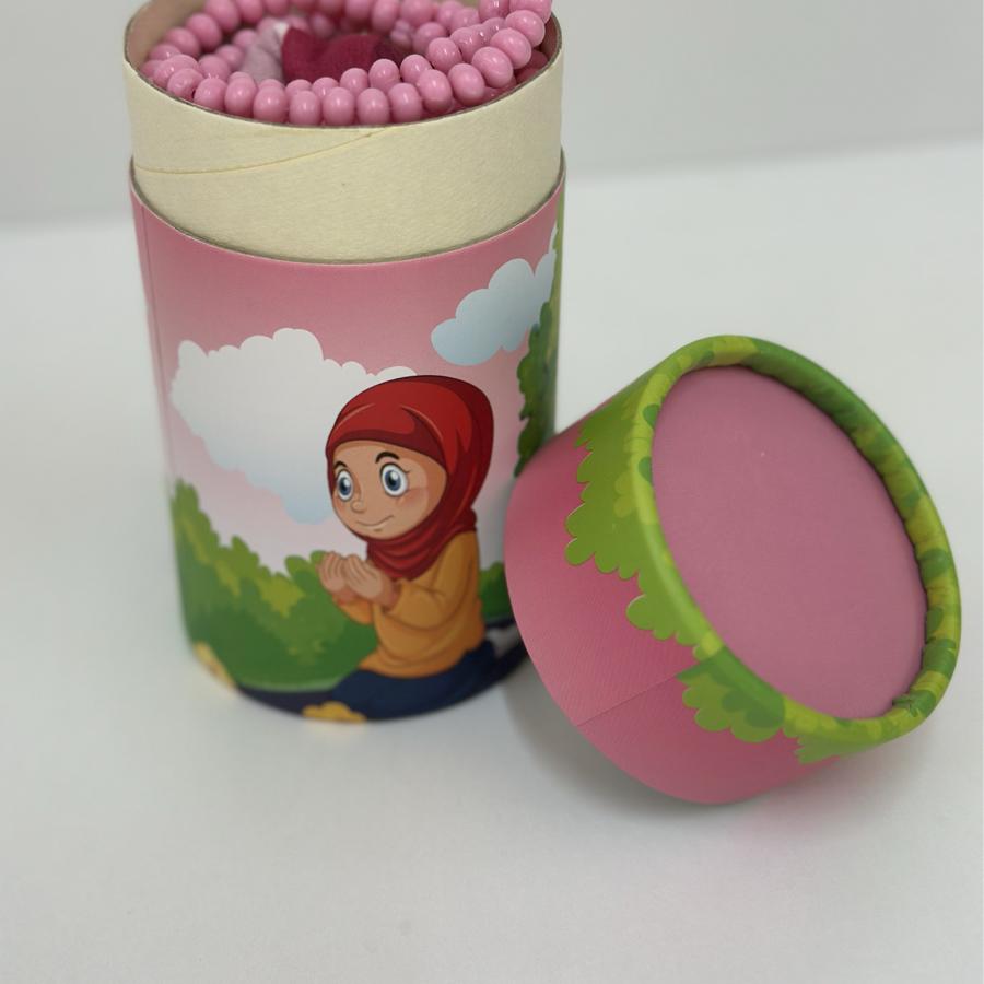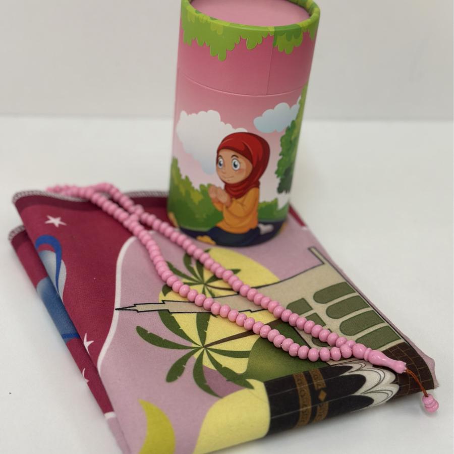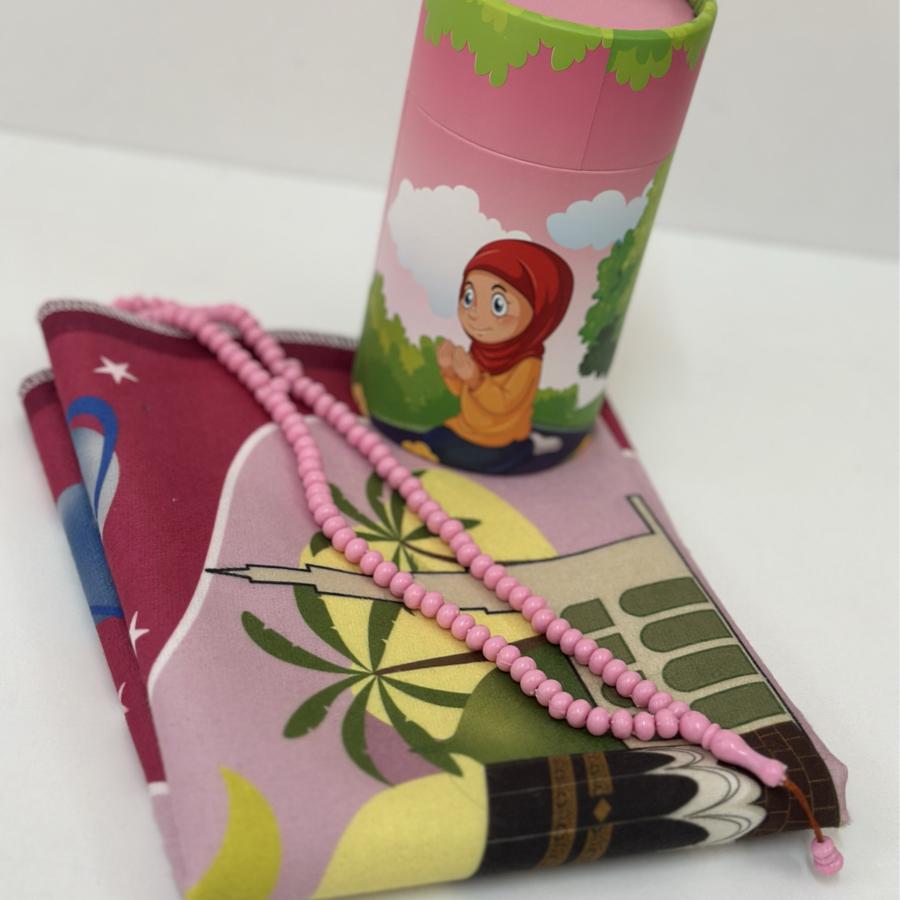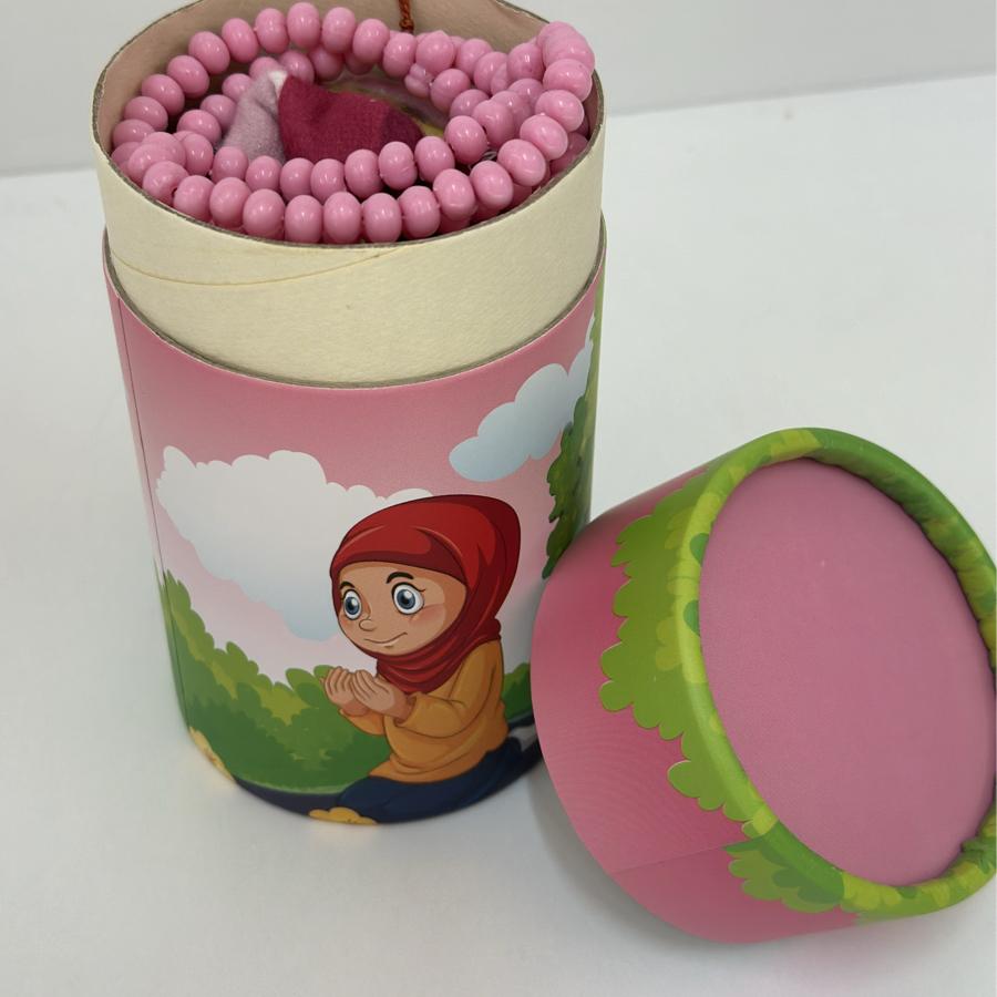 Silindir kutu içinde kız çocuğu seccadesi ve özel üretim Tesbih ürünler görselde görüldüğü gibi gelir